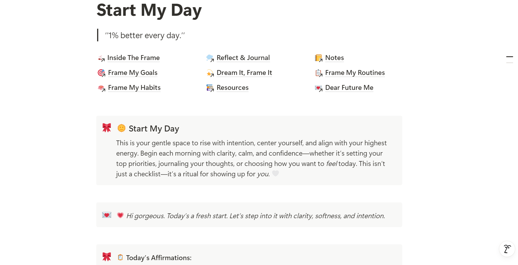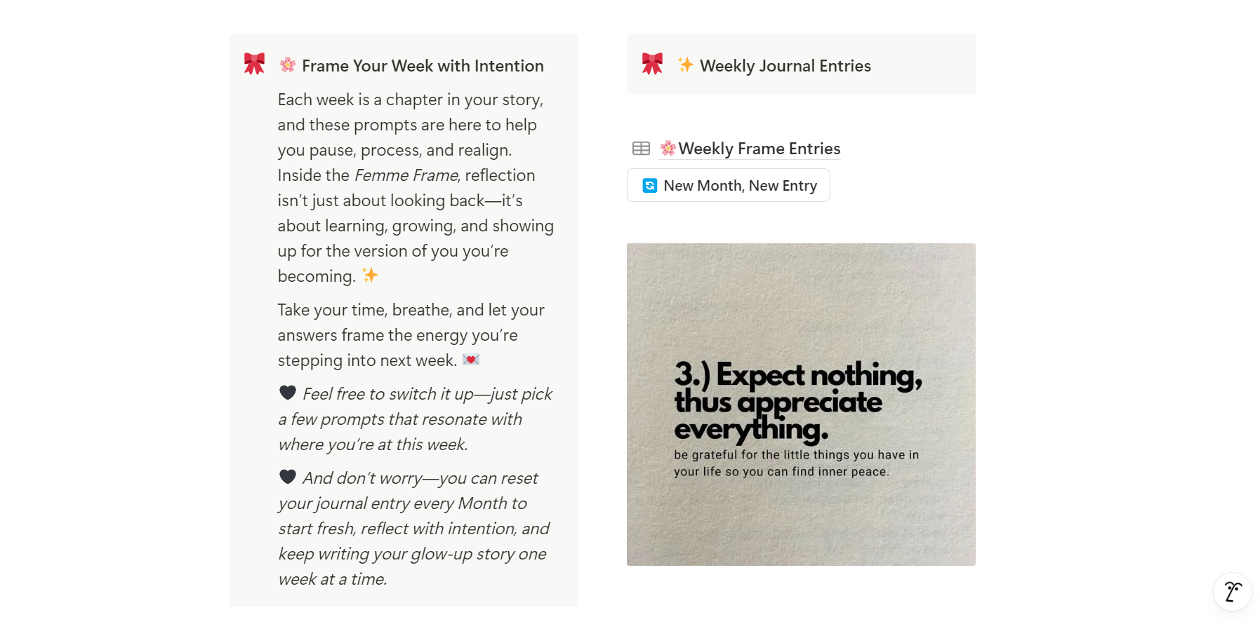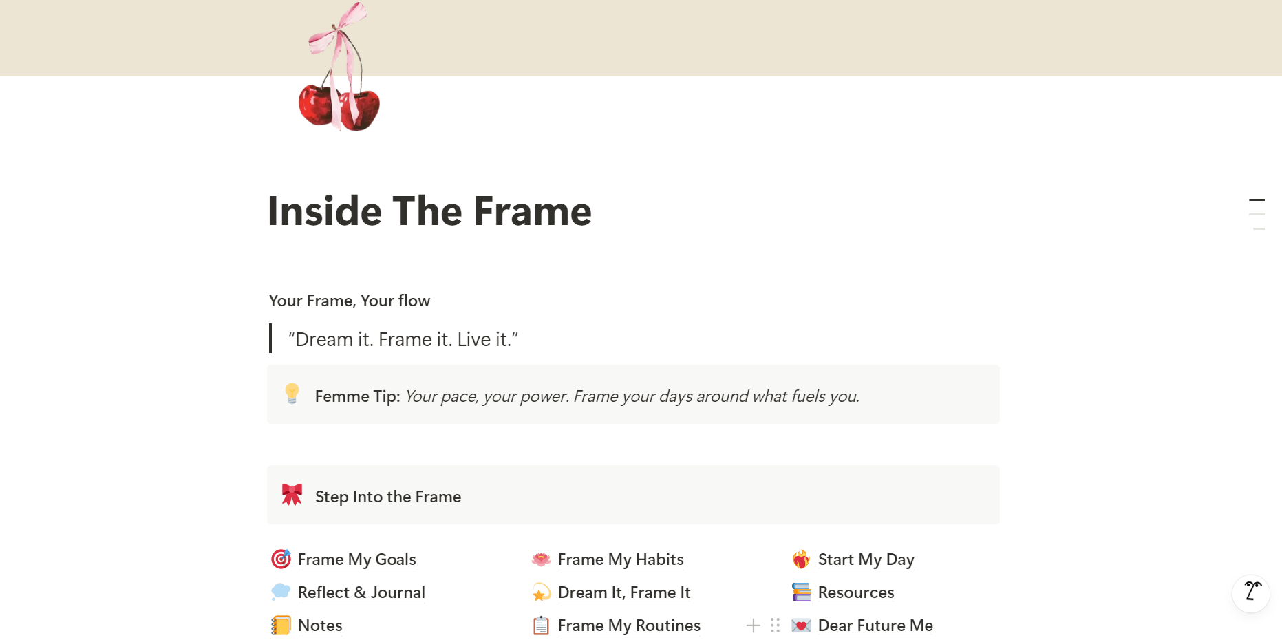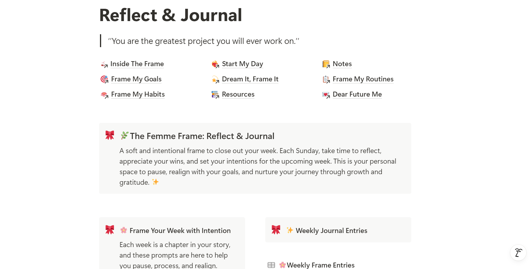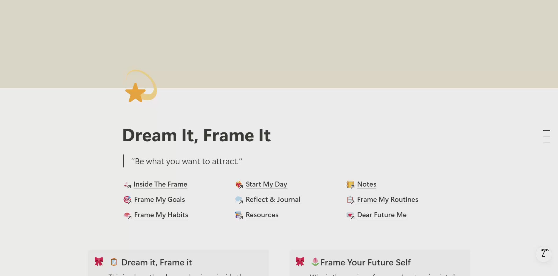You’ll receive a short, on-brand PDF guide with the full Notion template linked inside—so you can duplicate it and start framing your life right away.